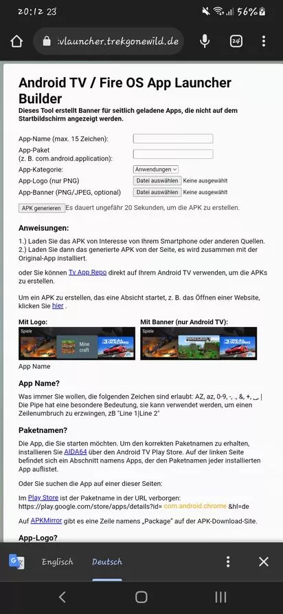 Mit dieser Website lassen sich sideload Apps für Android TV sichtbar machen als Symbole wenn eine apk installiert wird und nach der Installation die Verknüpfung nicht angezeigt werden.