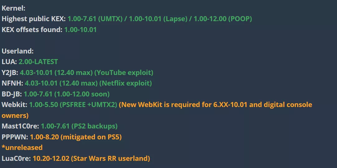 Ist wirklich ganz einfach, der Userland-Hack lädt den Kernel Hack auf der PS5. Dabei ist es egal welchen Userland Hack man benutzt, alle laden dann am Ende den (einen) Kernel Hack. Der aktuellste Kernel Hack geht bis 10.01.